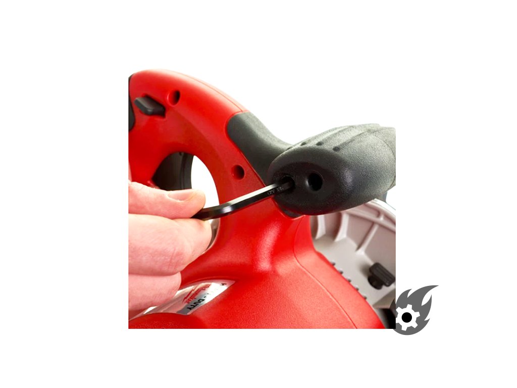 - Aretace vřetena pro snadnou výměnu pilového kotouče (nástroj je součástí rukojeti)