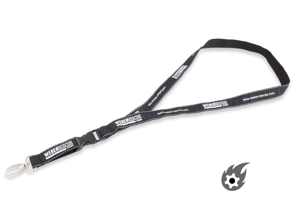 Klíčenka WEBER RESCUE má zaklapávací karabinu otočnou o 360° (20 mm), která je připevněna ke krátkému popruhu pomocí plastové spony na vlastním lanyardu. Tato má délku 900 mm a šířku 20 mm a skládá se z pevného polyesteru s našitou a potištěnou stuhou. Po celém obvodu jsou našité 2 stříbrné reflexní švy, se kterými jste neustále vidět i ve tmě.