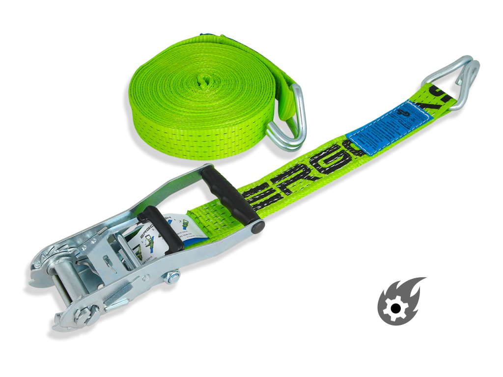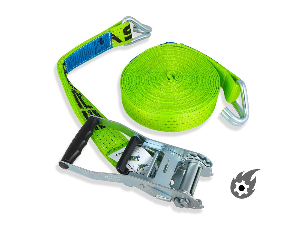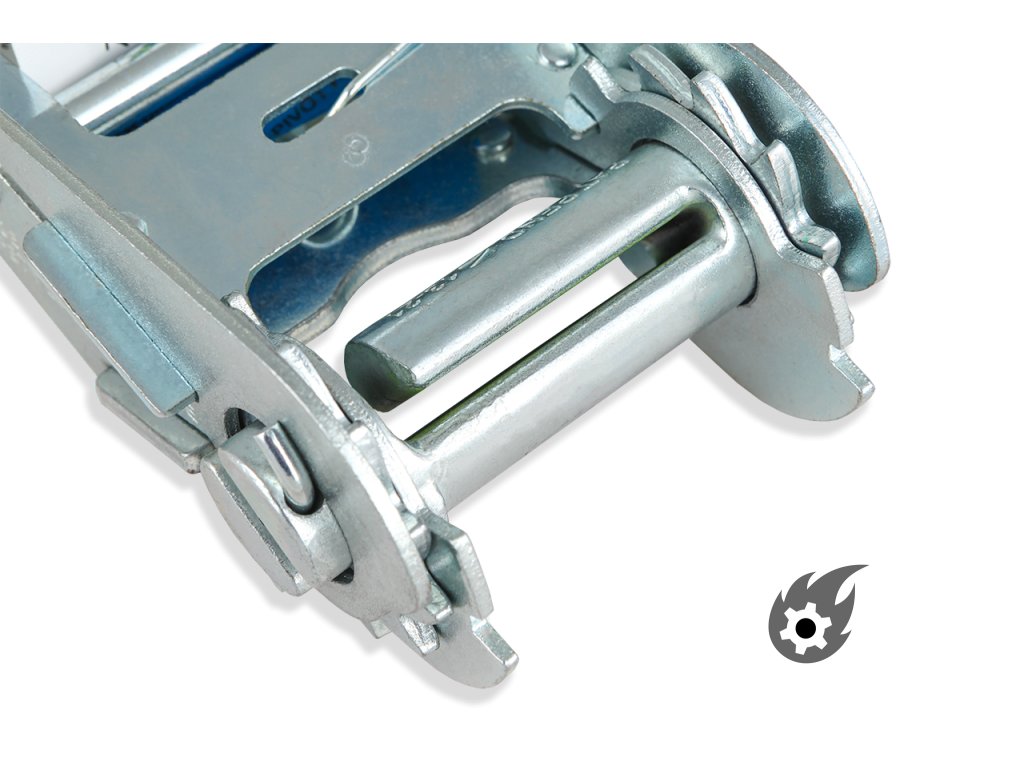 Ráčna je obzvláště stabilní a plně chráněna proti korozi zinkováním. Napínací pás splňuje všechny požadavky na stabilitu, odpovídá normě EN 12195-2 (potvrzeno TÜV Süd) a lze jej proto bez váhání použít jako bezpečnostní zařízení v silničním provozu.