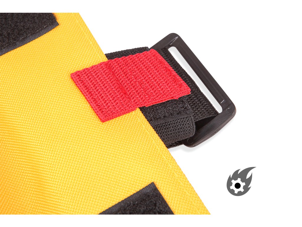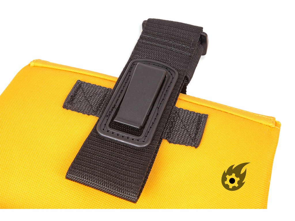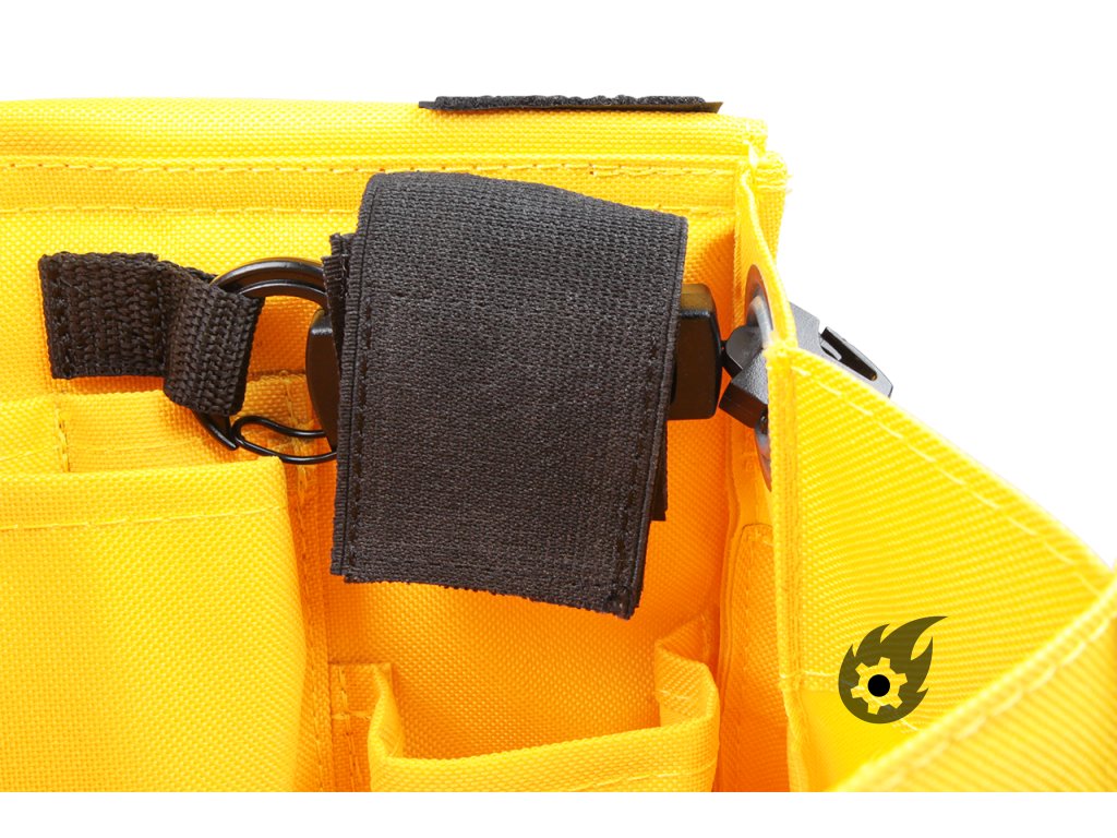 Víko umožňuje úplné uzavření brašny na nářadí, takže nic nevypadne, i když budete muset pracovat nad hlavou nebo se budete naklánět do interiéru vozidla. Víko lze pro lepší přístup připevnit k popruhům suchým zipem, takže zůstane po celou dobu otevřené.