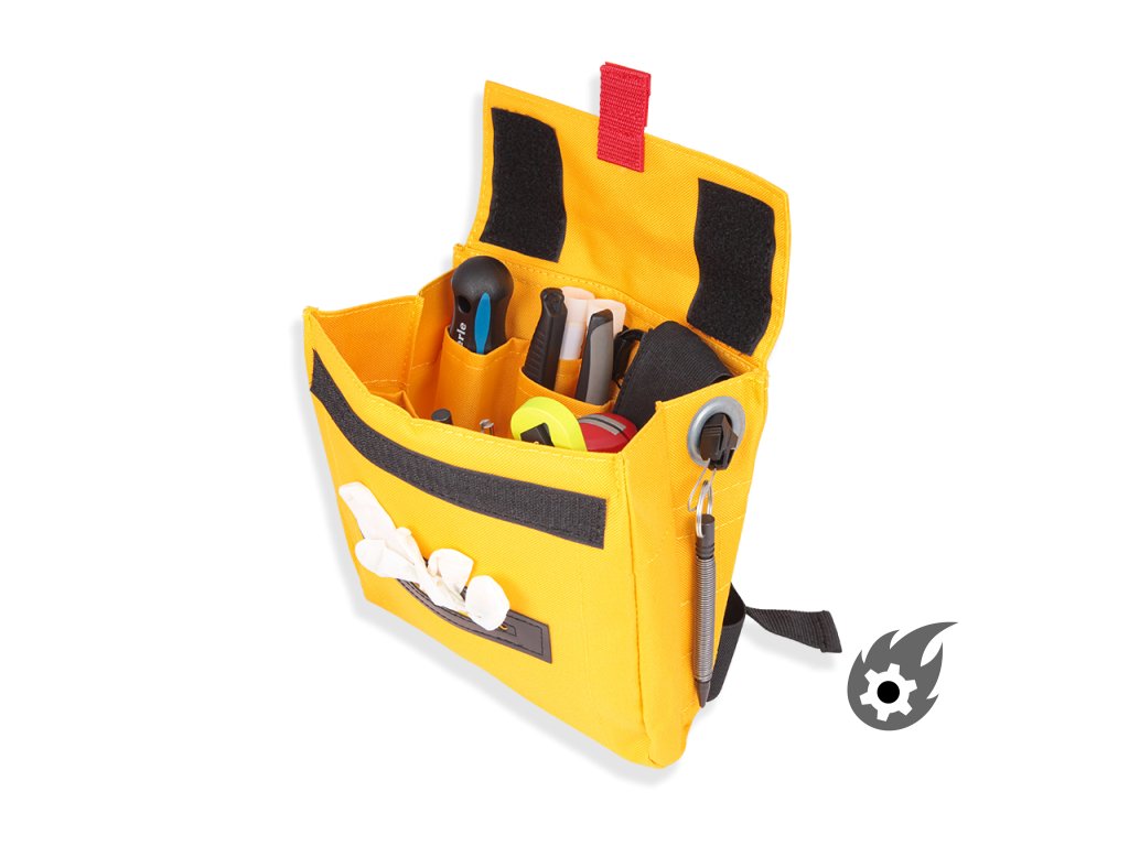 Pro nástrojáře je uvnitř tašky odpovídající místo včetně průchodky (kovové očko) pro lano ven. Důležité menší věci tak mohou být připojeny přímo po ruce. Díky 2 všitým magnetům můžeme pomůcky upevnovat na vnější stranu pouzdra. Na přední straně zásobník nabízí prostor až pro 5 párů jednorázových rukavic.