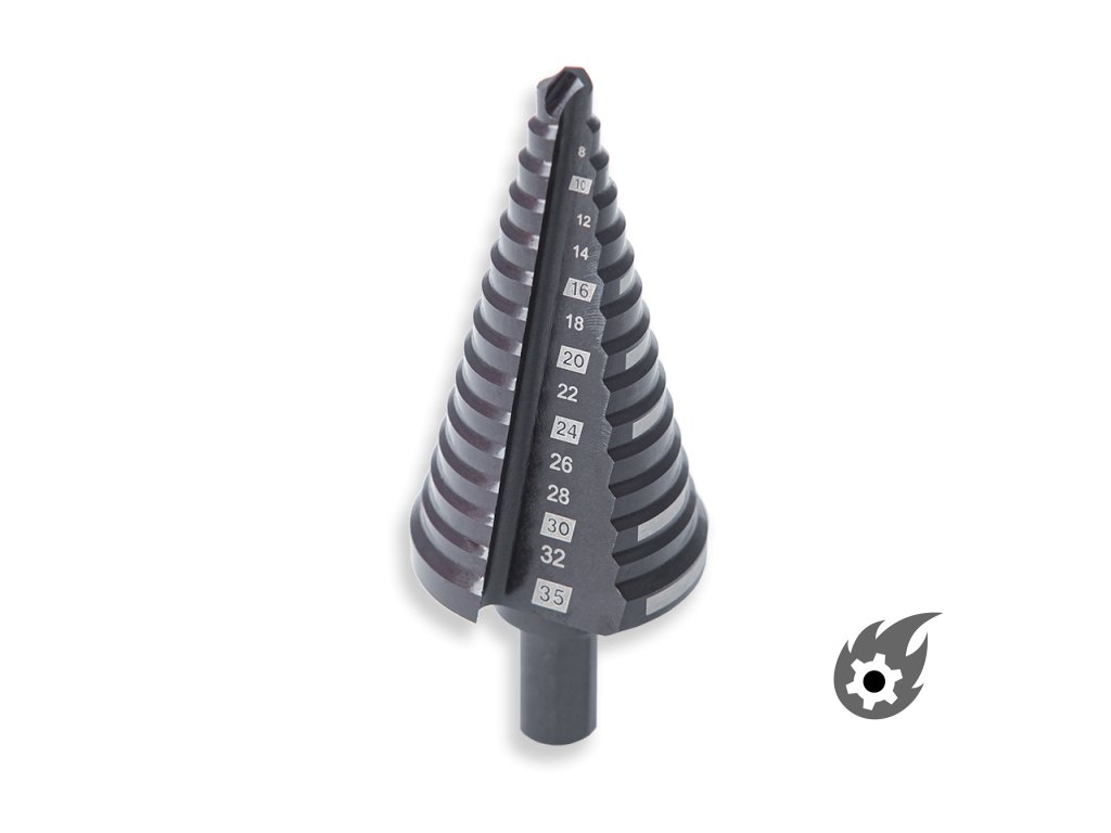 Špička vrtáku RAPID STRIKE™ se sama vycentruje a zajišťuje bezpečný výchozí bod pro stupňovitou vrtačku. Díky speciálně vyvinuté geometrii jednotlivých stupňů je vrtání bez chvění a bez naklánění. Přídavné spirály s nabroušenými hranami a reliéfně broušenými stupni zajišťují rychlý postup vrtání s optimálním posuvem vrtání a automatickým odstraňováním otřepů. Díky použité speciální oceli a dodatečnému černění je možná dlouhá životnost (až 4x delší než u běžných stupňovitých vrtáků). Vhodné pro všechny vrtačky díky stabilní stopce 10 mm se 3 upínacími plochami pro nejlepší přenos síly.
