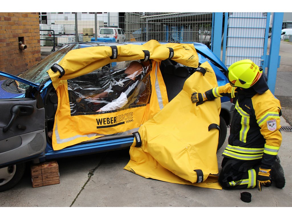 Vzhledem k tomu, že stále více vozidel je vyrobeno z hliníku nebo má velké plastové prvky v interiéru, ochranné kryty s integrovanými magnety již nedrží. Pomocí této spony je však lze snadno a bezpečně upnout, takže mohou chránit i před ostrými hranami nad hlavou a na všech materiálech. Uvnitř klipu je stabilní plast s vysokým předpětím, který vyvíjí dostatečnou sílu pro uchycení velkých a těžkých přikrývek. Je potažena zvláště odolnou tkaninou Cordura (nylon) odolnou proti roztržení a oděru, která se mimo jiné používá také na motocyklové ochranné oděvy. Díky zdrsněnému povrchu se dobře drží i za deště a dobře drží i na hladkých materiálech. Látka je také voděodpudivá a rychleschnoucí. Na místě mimořádné události si mohou záchranáři klipy připevnit přímo na opasky nebo na nohy přes ochranný oděv tak, aby byli vždy na dosah. Doporučujeme použít alespoň osm spon na sadu ochranných krytů.